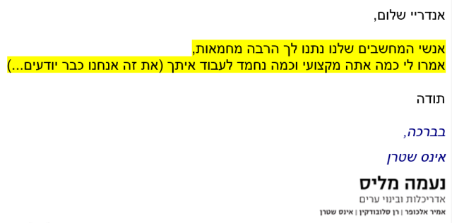 אנשי המחשבים שלנו נתנו לך הרבה מחמאות, אמרו לי כמה אתה מקצועי וכמה נחמד לעבוד איתך (את זה אנחנו כבר יודעים...)