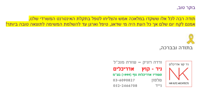 תודה רבה לכל אלו ששקדו במלאכה אמש והצליחו לטפל בתקלת האינטרנט המשרדי שלנו.