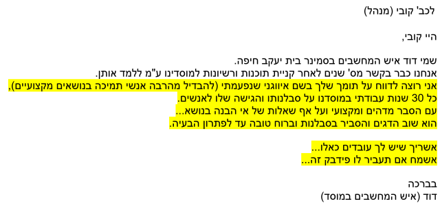 שמי דוד, איש המחשבים בסמינר בית יעקב חיפה.